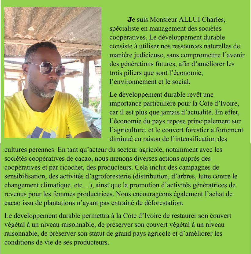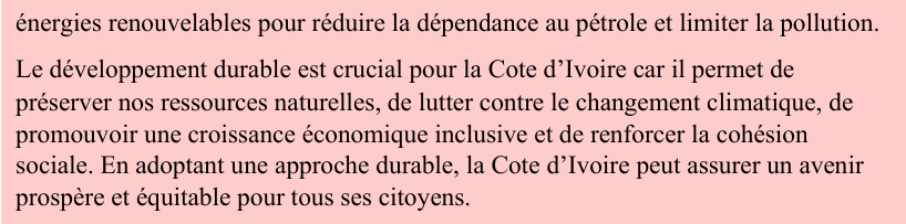 l’environnement, en aidant les populations à vivre mieux, et en réalisant une économie stable et équitable pour tous. Le développement durable est important pour la Côte d’Ivoire car il permet de préserver nos forêts, nos terres agricoles, notre eau, , tout en créant de l’emploi et en améliorant la qualité de vie des Ivoiriens.